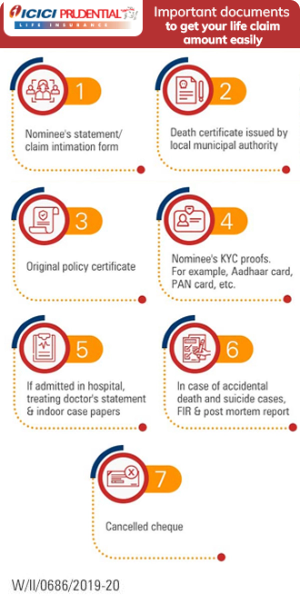 - Submit all necessary documents like the death certificate, hospitalisation documents, and others. KYC proofs of the nominee, like Aadhaar card, PAN card, or any other required document. FIR papers in case of suicide or accidental death, and a cancelled cheque